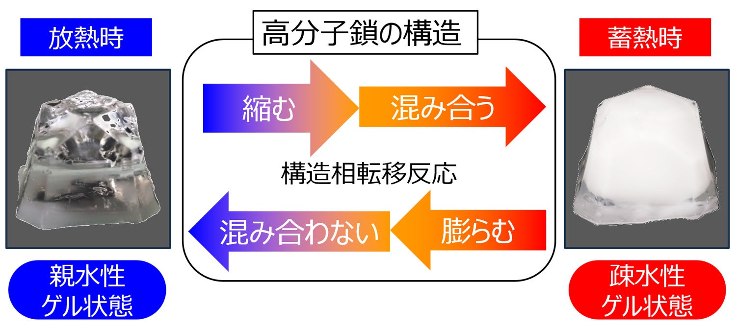 ・感温性高分子ゲルの、温度によって親水性と疎水性に変化する構造相転移反応と、水分子間の水素結合反応を組み合わせた連成反応により、高分子混雑環境下で水分子の配列構造が乱れてエネルギーが高くなり、低温の熱でも高密度に蓄熱できることを世界で初めて実証