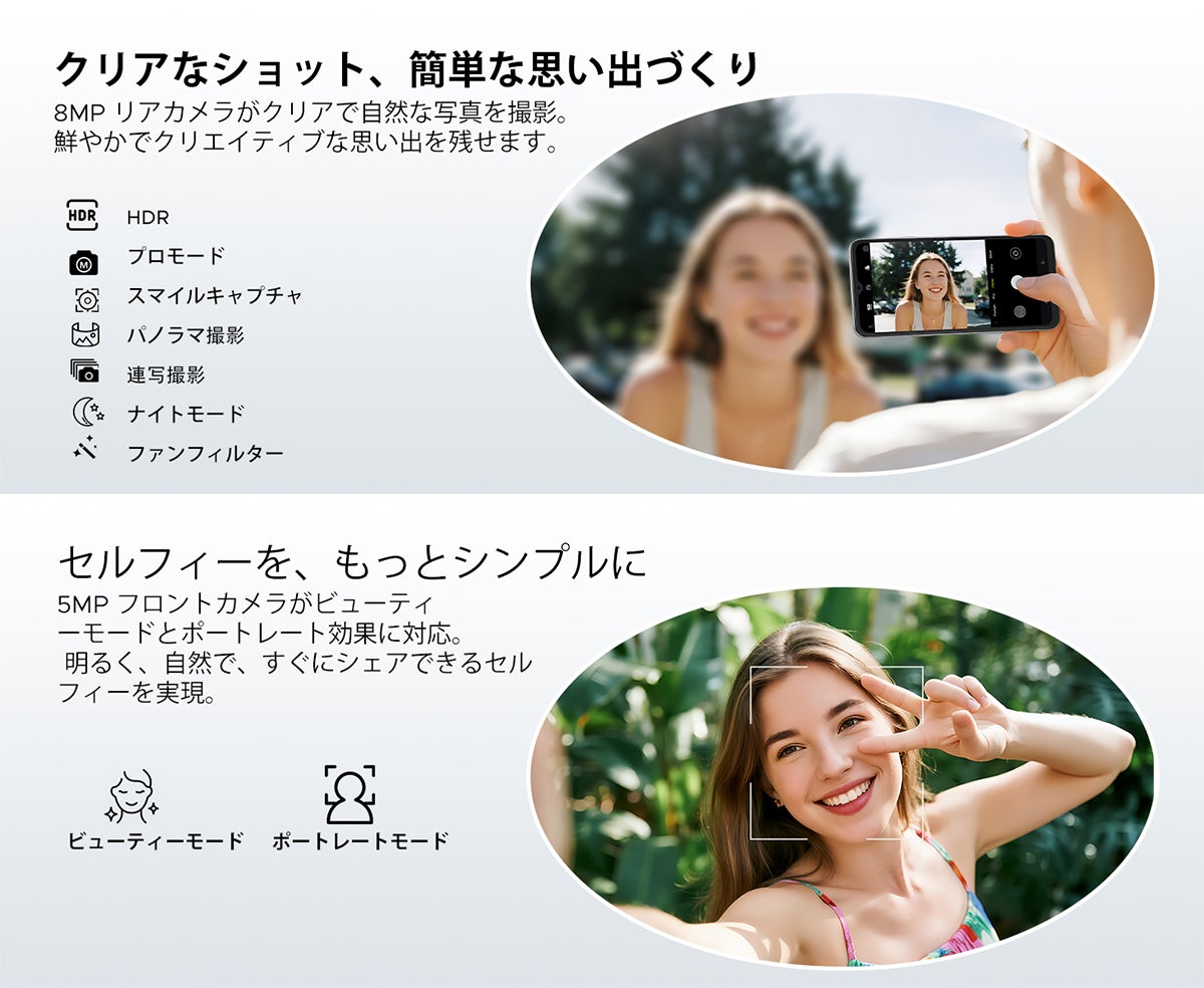 背面8MPメインカメラと5MPフロントカメラを搭載し、HDR・ナイトモード・美顔補正など多彩な撮影モードを搭載。