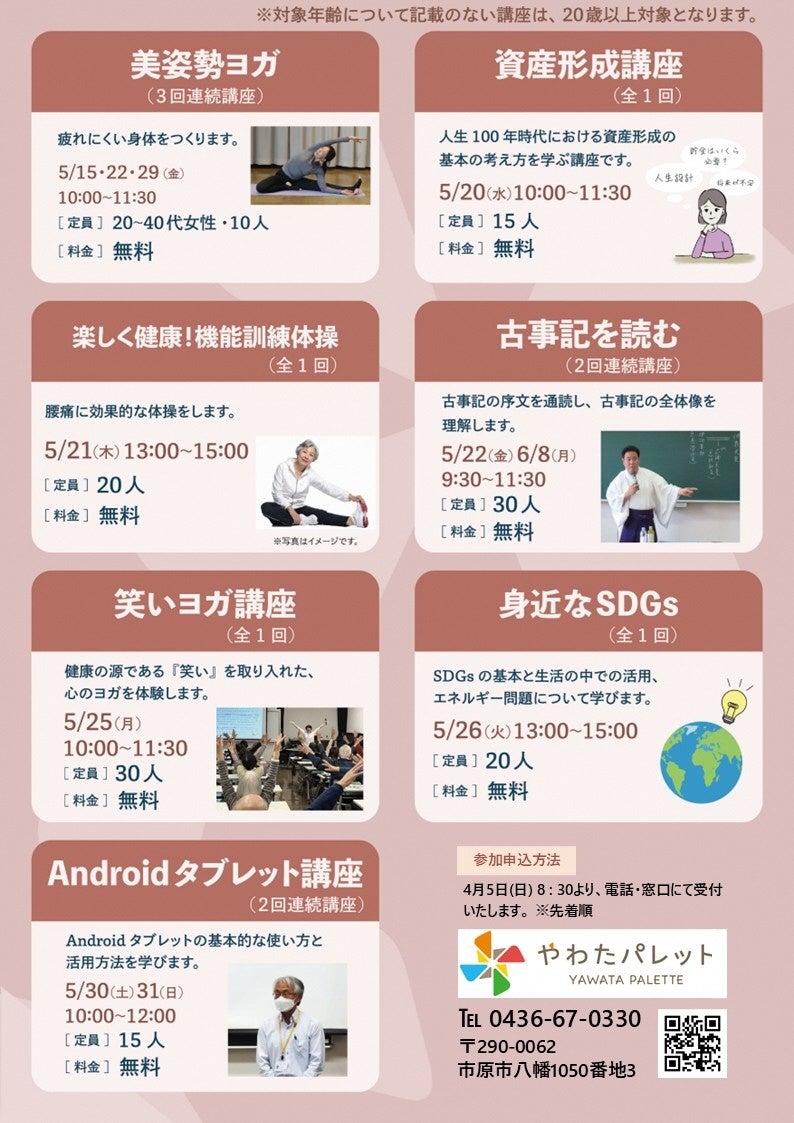 開催月(連続講座は初回開催月)の前月5日8時30分より電話(0436-67-0330)、窓口で受け付けています。(先着順)