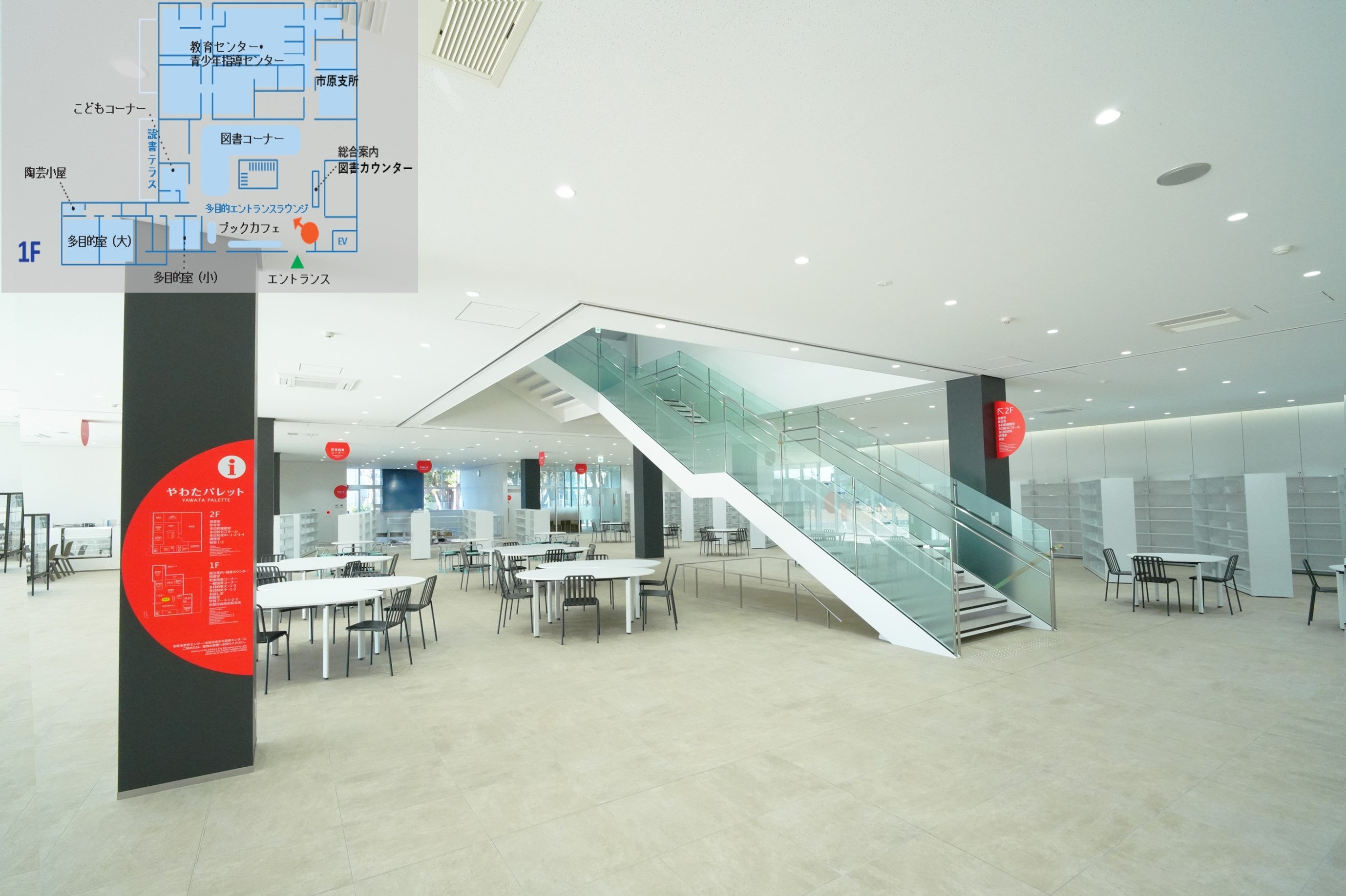 八幡公民館や市原支所など、JR八幡宿駅西口周辺に立地する6つの公共施設を集約した新しい複合施設です。