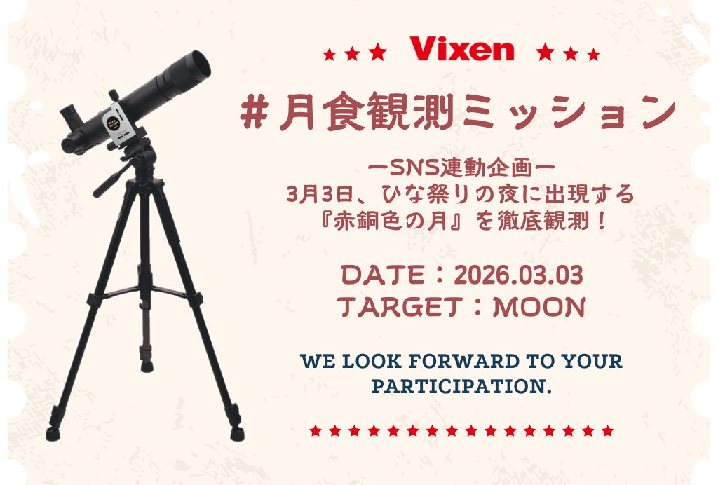 総合光学機器メーカー株式会社ビクセン(本社:埼玉県所沢市、代表取締役:新妻和重)は、2026年3月3日(火)に全国で起こる「皆既月食」に向け、SNSを通じて全国の観測結果を共有する「月食観測ミッション」を実施します。