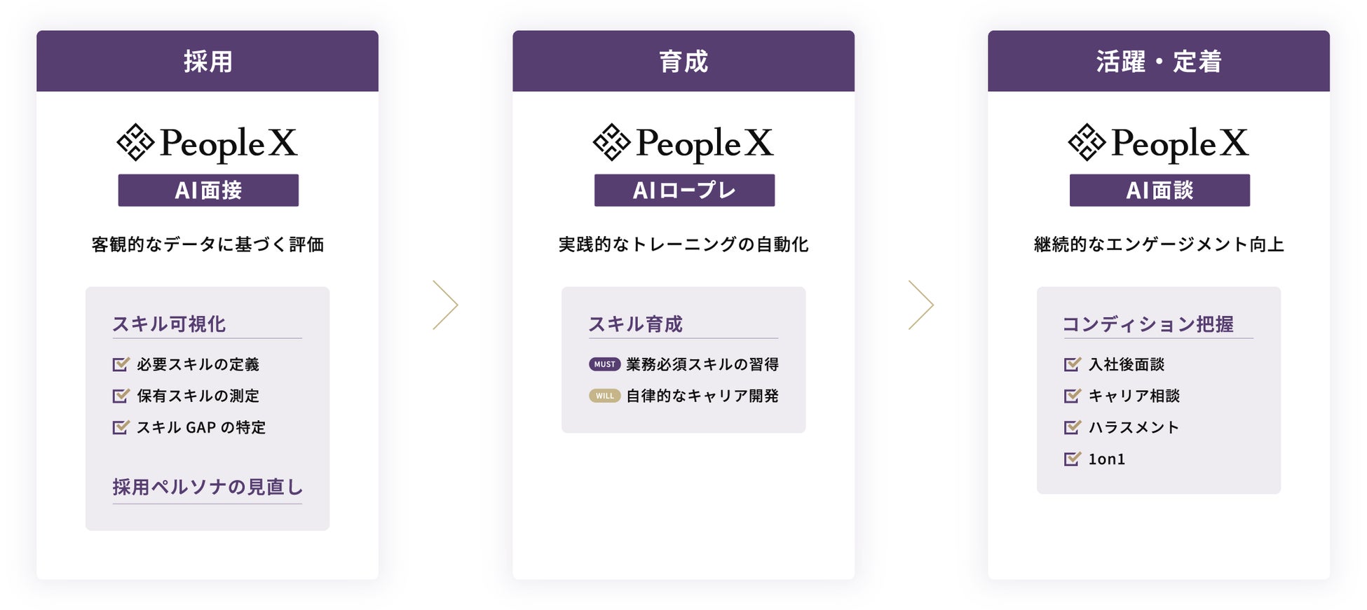 3サービスはそれぞれ、AIとの対話を活用し、採用(AI面接)、育成(AIロープレ)、活躍・定着(AI面談)をサポートするものです。これらをまとめてご利用いただくことで、採用から育成、活躍・定着までを通して「PeopleX AIワーカー」シリーズによる総合的な業務効率化や質の向上を図ることが可能となります。