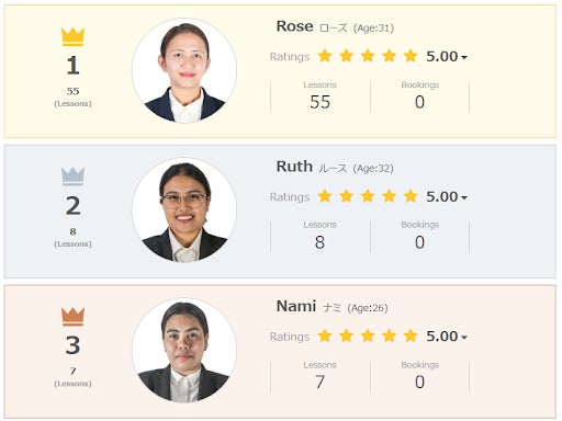 ユーザーからのレッスン予約数に基づいたランキングです。