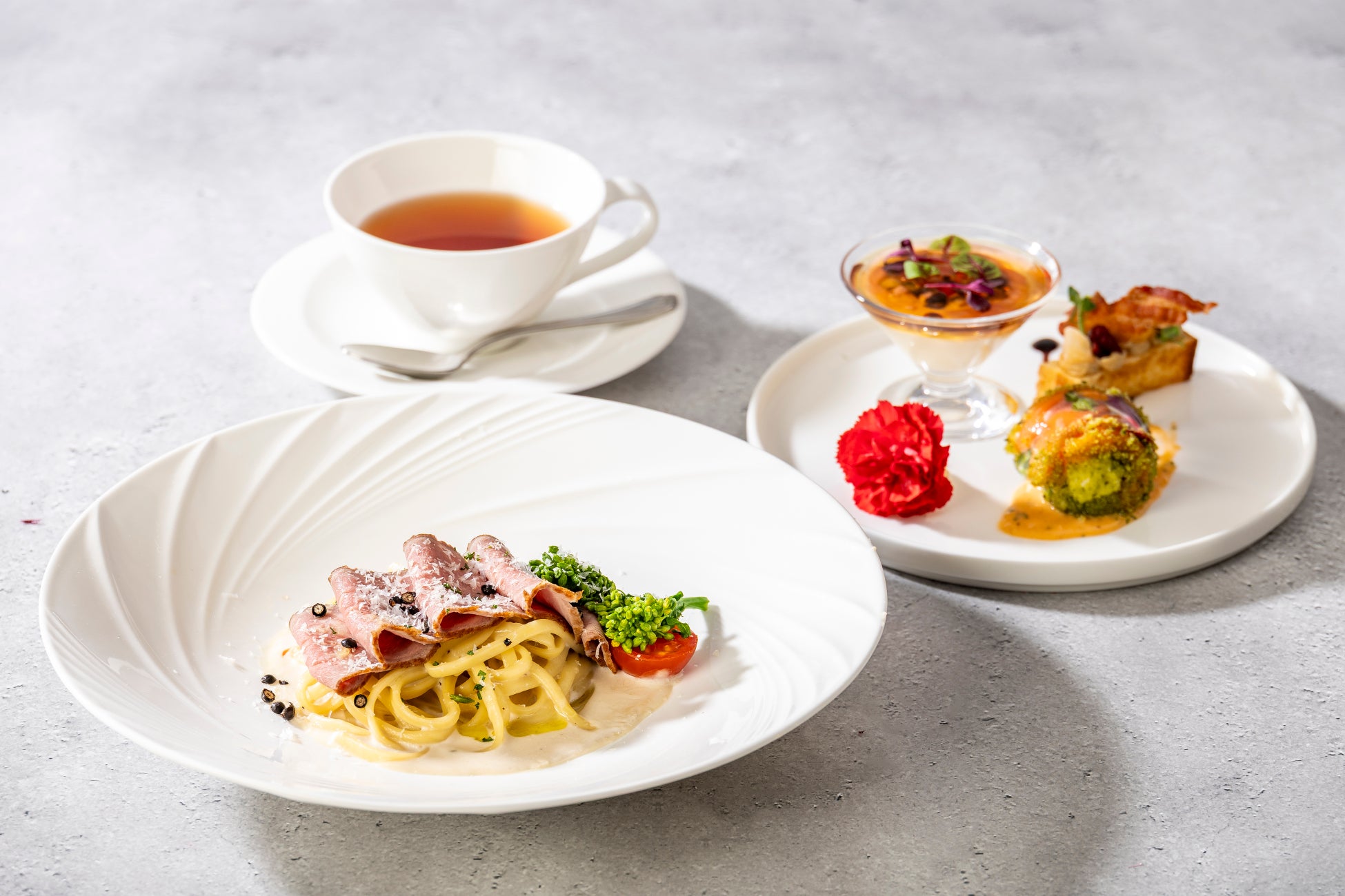 母の日アフタヌーンティーは、一般的な“スイーツ中心”のスタイルとは一線を画し、メインディッシュやセイボリーを充実させた「コース仕立て」の内容が特徴です。牛ロースのローストビーフを乗せた生パスタのカチョエペペをはじめ、華やかな前菜、多彩なスイーツまで、五感で楽しむラインナップをご用意。アフタヌーンティーとしてはもちろん、満足感のあるランチとしてもお楽しみ頂けます。