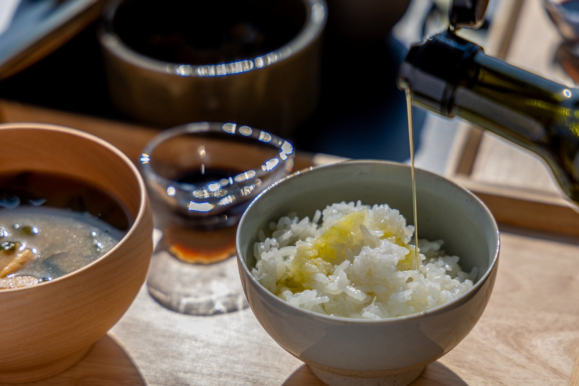 ・小豆島の棚田米を鉄鍋で炊き、自社栽培の小豆島産オリーブオイルをかけていただく小豆島の朝ごはん体験。小豆島のお醤油や佃煮、海苔も合わせて提供。