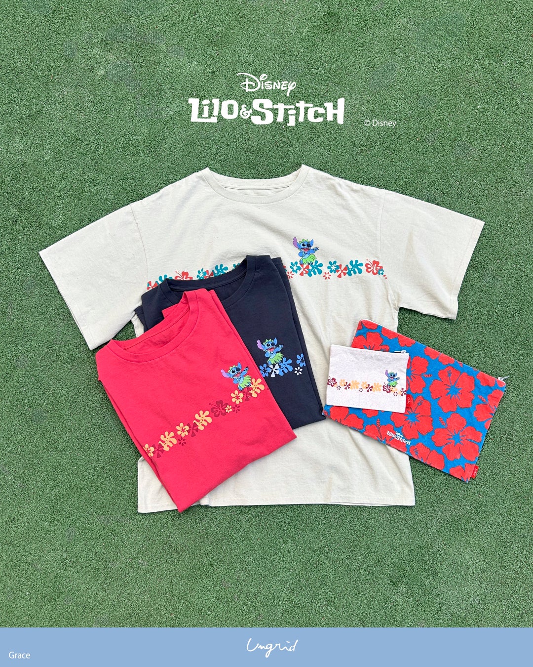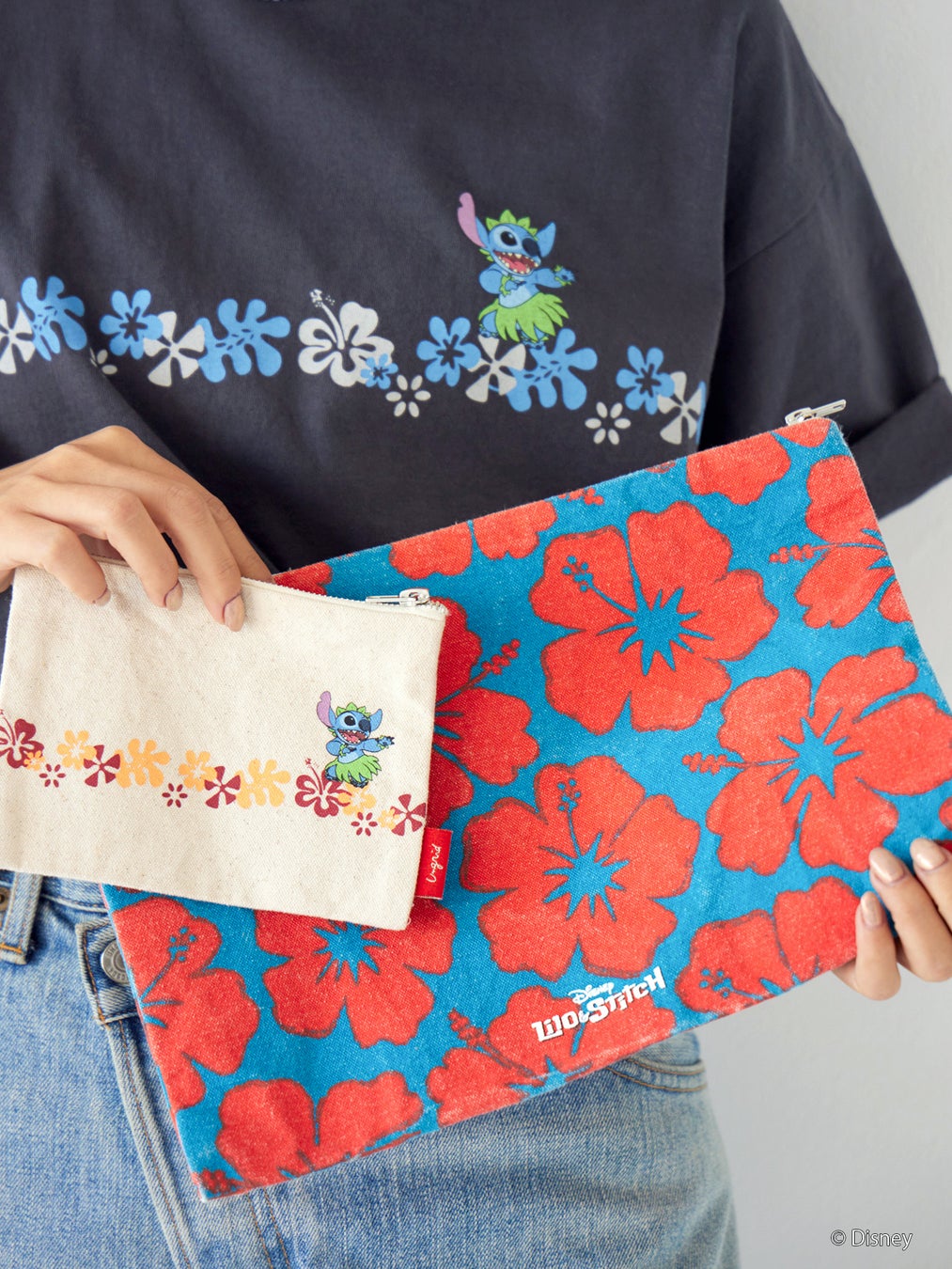 『リロ&スティッチ』の世界観を、南国ムード漂うフラワーモチーフとスティッチで表現しました。Tシャツにはフラダンスを踊るスティッチをデザインし、カラフルな配色も相まって夏らしい1枚に。プリントは少しかすれた風合いでUSED感を演出し、Ungridらしいラフでカジュアルな仕上がりになっています。ポーチはサイズ違いの2つセットで、デイリー使いに便利。Tシャツとお揃いのスティッチプリントと、目を引くハイビスカス柄を総柄で落とし込んだ、キャッチーなデザインが魅力のアイテムです。