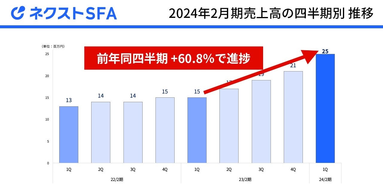 7月14日発表の2024年2月期第1四半期決算では、ネクストSFAの売上高が前年同四半期比+60.8%と伸びており、売上、粗利ともに過去最高を達成しています。