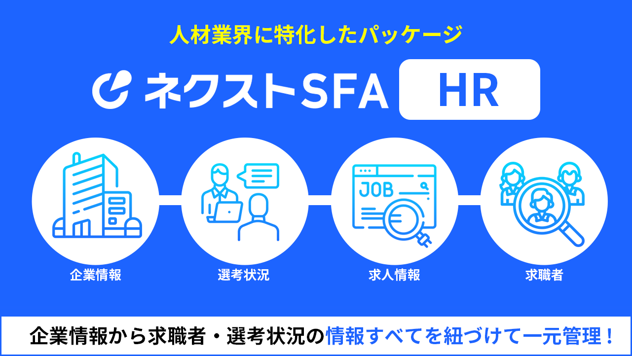 一般的なSFAは企業を軸にした案件の管理しかできないものが大多数ですが、「ネクストSFA_HR」は、通常は別のツールを使わないとできない、求職者の管理、求人情報の管理、選考状況を一つのツールで簡単に管理することができます。