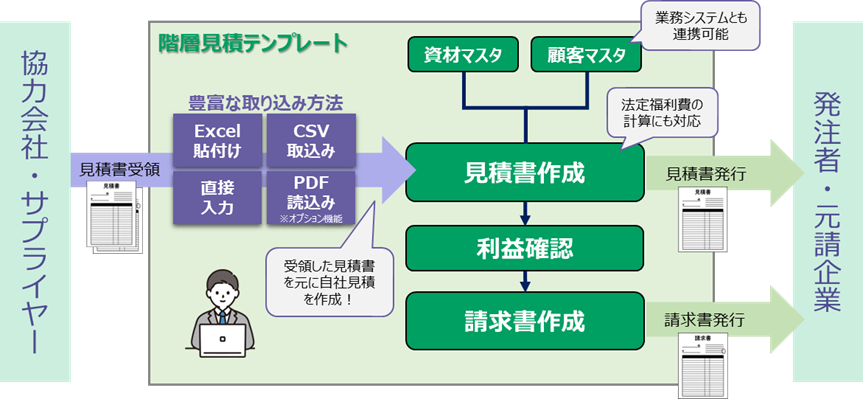 建設業では、工事や作業内容を階層構造で整理しながら見積金額を算出する「階層見積*」が採用されています。しかし、現場ごとに最適化されたExcelやAccessでの見積作成が一般化しているのが実態で、組織内で見積書の精度に差が生じたり、法改正で求められる要件を満たさない見積書が作成されたりしている状況がみられます。そのため、誰でも同じ品質の階層見積書を作成できるように、見積作成業務を標準化し、属人化を解消することで、契約交渉時に発注者へ見積根拠を確実に示せる体制を構築することが求められます。