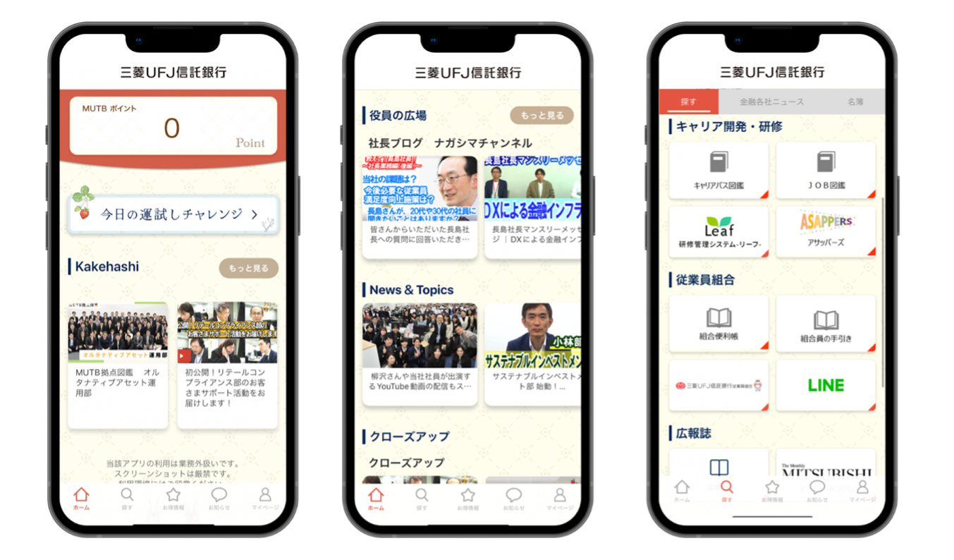 三菱UFJ信託銀行社内向け「Kakehashiアプリ」における特徴をご紹介します。