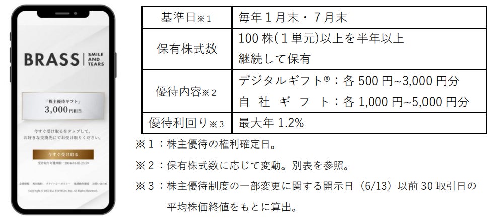 株式会社ブラスの株式を100株以上保有されている株主様を対象とした株主優待として、自社ギフトに加え、選べるデジタルギフト®を優待品目としてご導入いただきます。