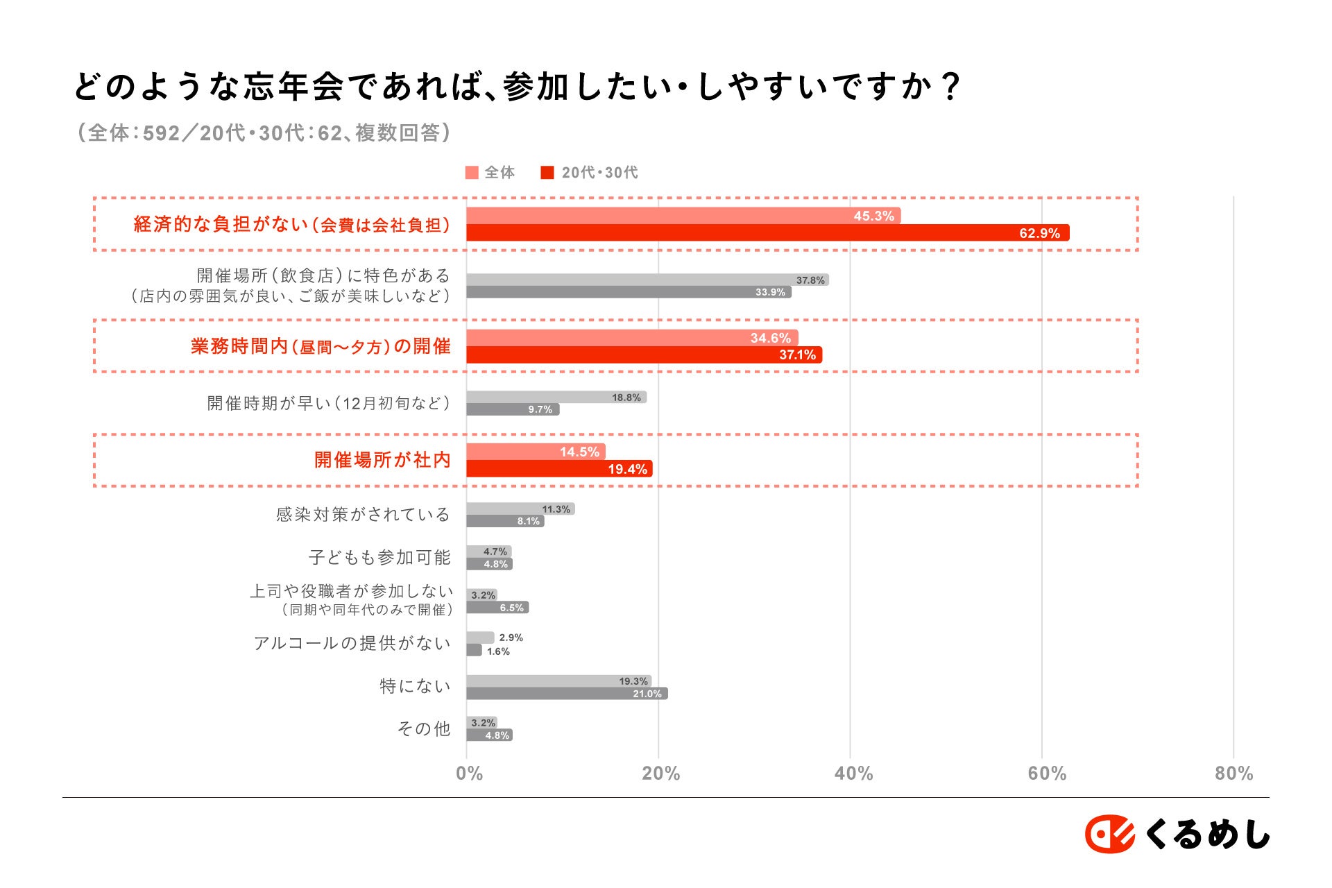 また、「どのような忘年会であれば、参加したい・しやすいですか?」という質問に対しては、「経済的な負担がない(会費は会社負担):45.3%」「開催場所(飲食店)に特色がある(店内の雰囲気が良い、ご飯が美味しいなど):37.8%」「業務時間内(昼間~夕方)の開催:34.6%」という回答が上位を占めています。