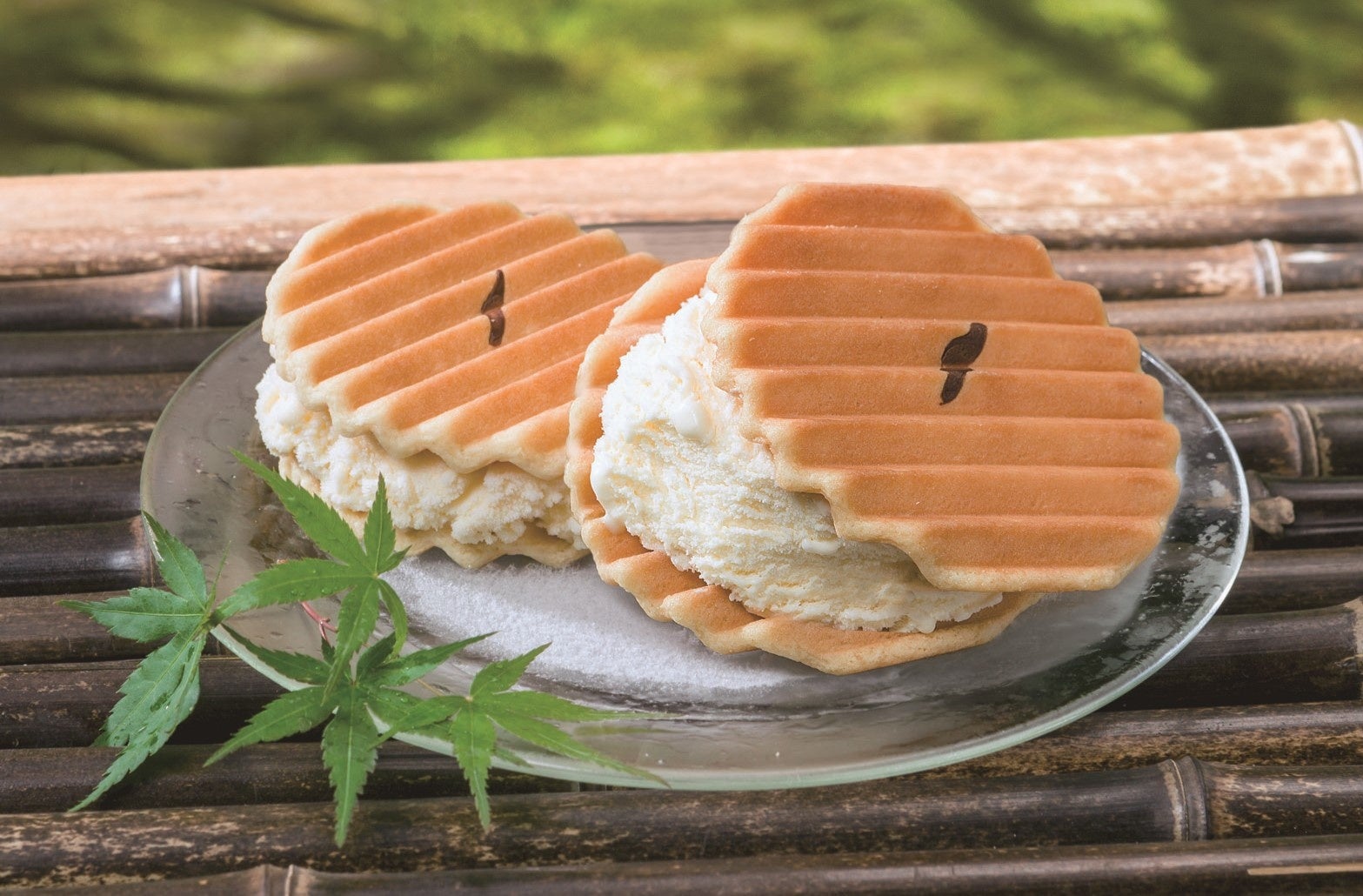 昭和38年に生まれた鼓月の代表銘菓「千寿せんべい」は、波型クッキー生地にクリームを挟んだ京菓子です。2014年に「千寿せんべいの」の波型クッキー生地にミルク感たっぷりのアイスクリームを挟んだ「千寿せんべいアイスクリーム」が誕生しました。口ほどけのよさとバニラの香り、ミルクの風味豊かな味わいが広がる一品です。