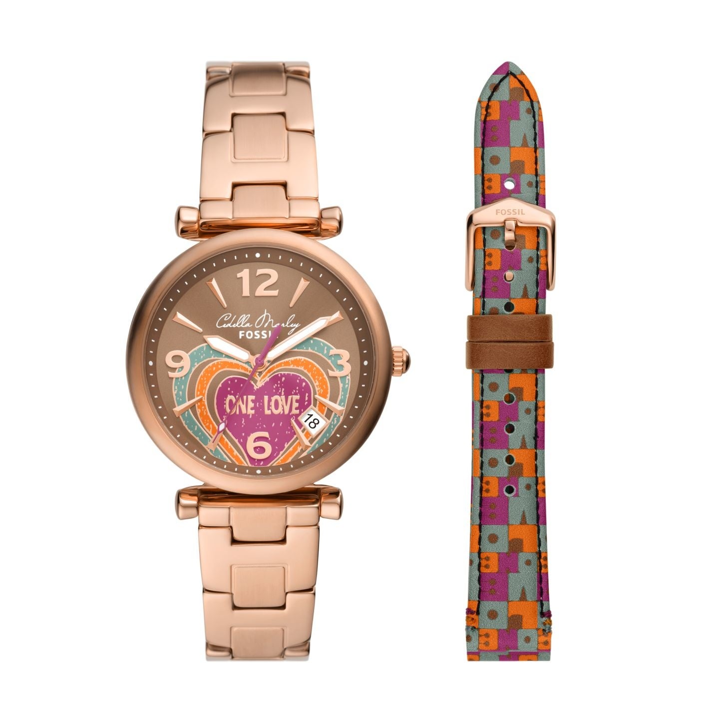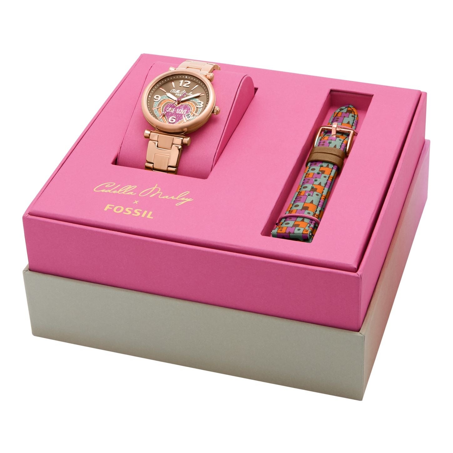 Cedella Marley x Fossil Watchは、人気のCarlie(カーリー)に、「One Love」の歌詞とハートのデザインをあしらい、ケースバックにはセデラのサインが刻印されています。交換可能なローズゴールドトーンのブレスレットと、マルチカラーのストラップがセットになったボックスセットは¥26,400(税込)で販売される予定です。クオーツ、ケース径35mm。