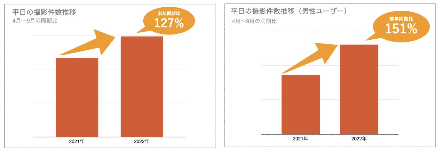 まず、「fotowa」の平日の撮影件数の変化をみてみると、2022年4月〜9月末の平日の撮影件数は前年の同時期に比べて約30%増加しています。中でも、男性ユーザーの平日の撮影件数は51%増加しており、平日に撮影を依頼する男性ユーザーが増えていることがわかります。
