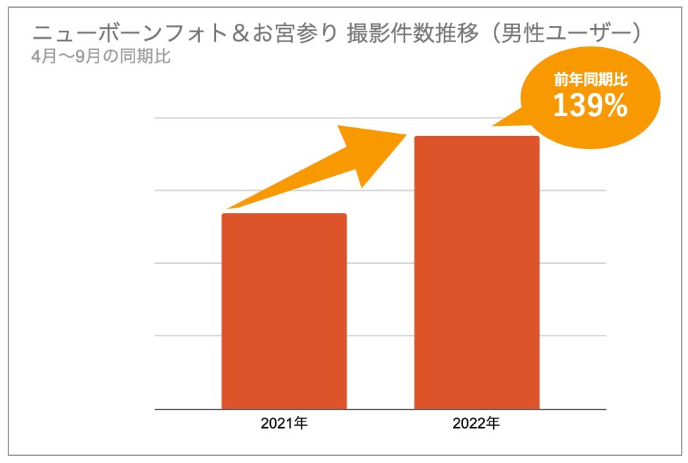 こうした背景から、「ニューボーンフォト(https://fotowa.com/newborn)」や「お宮参り(https://fotowa.com/first-shrine-visit)」など、生後3ヶ月の間に行われる赤ちゃんの撮影を多く手がける「fotowa」では、改正育児・介護休業法が段階的に施行された2022年の4月以降、男性ユーザーの平日の撮影件数が前年の同時期に比べて約50%増加していることが分かりました。