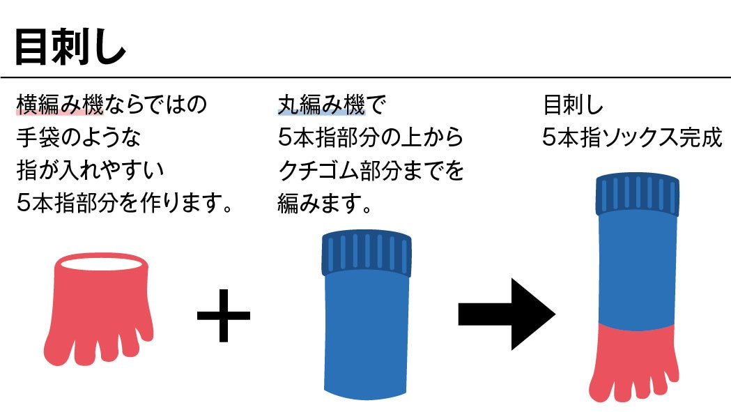 横編み機で編んだ指部分とレッグ、クチゴム部分は「目刺し」という手法でつなぎ合わせます。まずは指部分のみを横編み機で編みます。次に指部分の編み目を一目ずつ拾って手作業で丸編み機にセットし、レッグ部からクチゴムまでを編みます。この手法によって、履きやすい指部分と締め付け感が少ない口ゴムなど様々な商品特徴を組み合わせることができます。