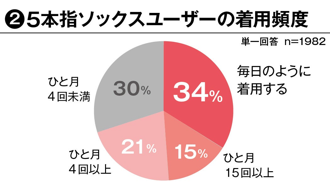 ①で「履いたことがあり、今も履いている」と答えた人に着用頻度を訊ねたところ「毎日のように着用する」と答えた人が34%に上りました。①の結果と合わせて、約10人に1人は5本指ソックスヘビーユーザーであることが判明しました。