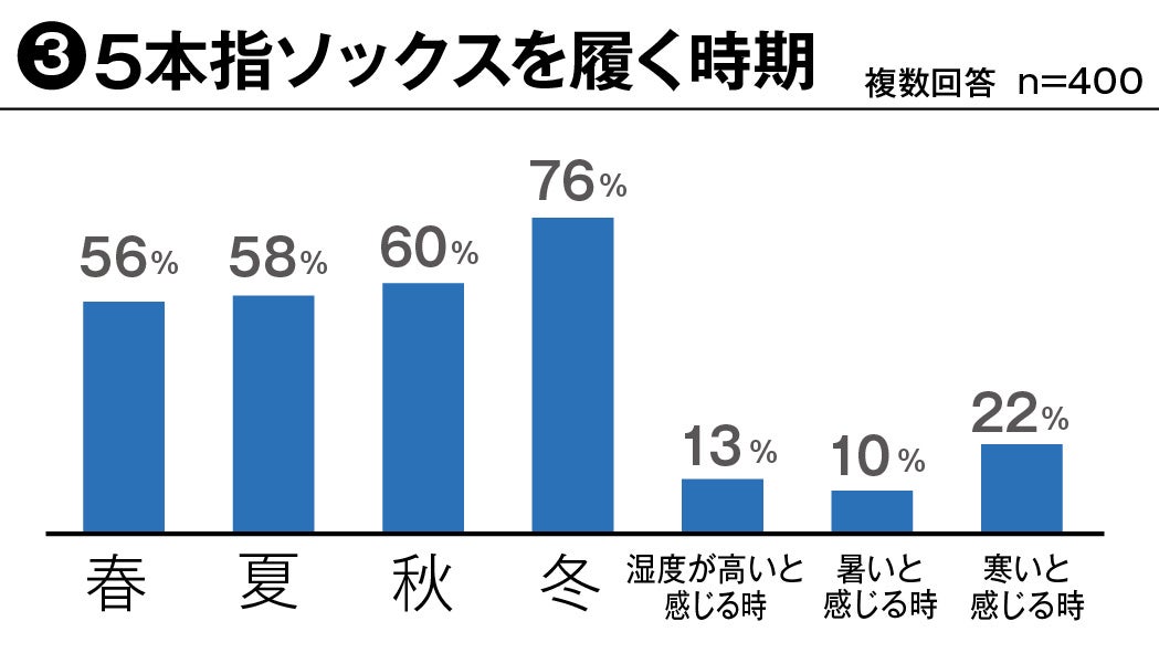 本調査で5本指ソックスを履く時期について尋ねたところ「冬」が最も多い結果となりました。特に女性では「冬」「寒いと感じるとき」の回答が多く、防寒目的で着用されているようです。