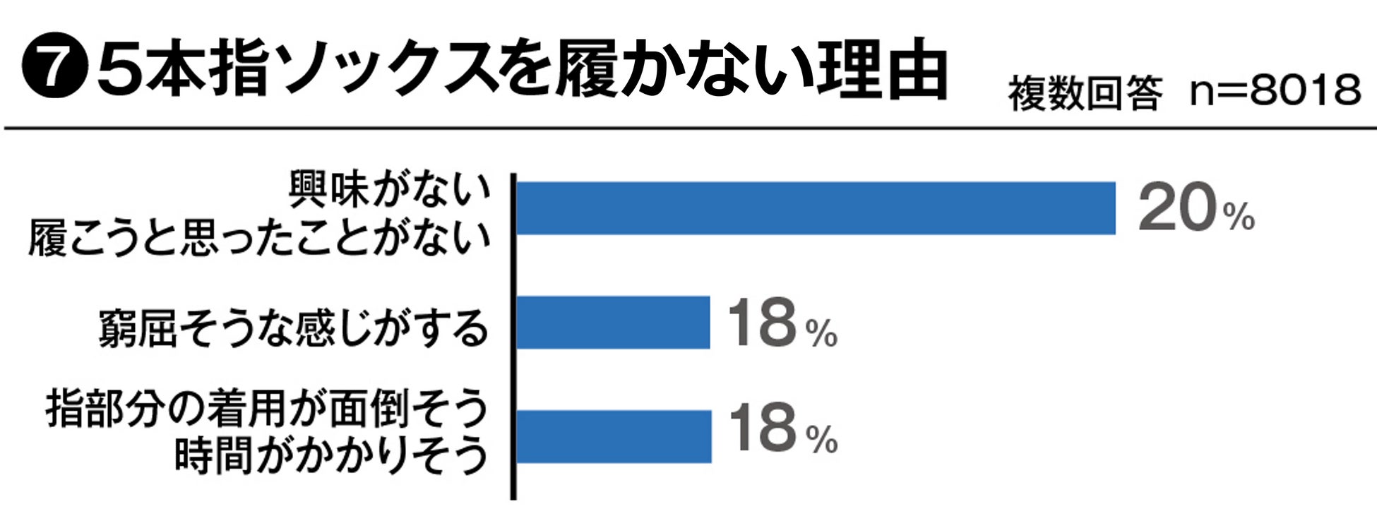 ①で「以前は履いていたが、今は履いていない」「履いたことがない」と答えた人に理由を尋ねたところ、機能面の理由として「窮屈そうな感じがする」「面倒そう/時間がかかりそう」がランクイン。窮屈でなく簡単に履ける5本指ソックスには一定の需要があると推測されます。