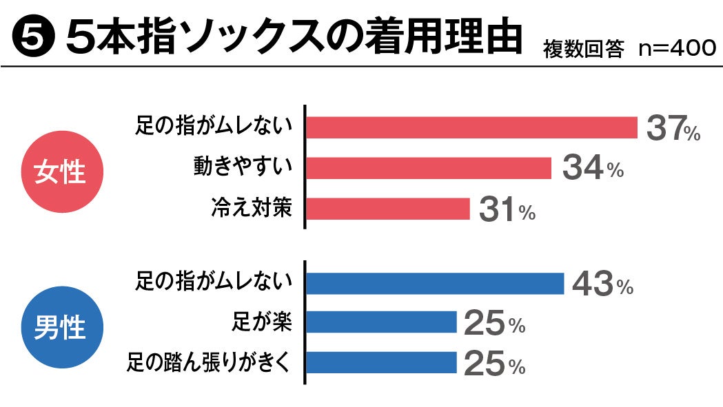 5本指ソックスユーザーに着用の理由を尋ねたところ、男女ともに「足の指がムレない」がトップでした。足の指が開くため、ムレにくいことが一番の魅力と感じられているようです。女性では「冷え対策」のほかにも「健康的だから」など健康に着目した理由が見受けられました。