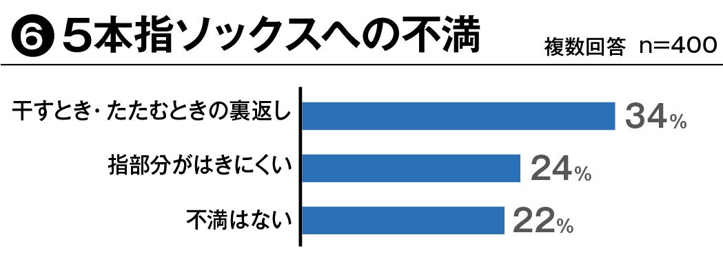 5本指ソックスユーザーに不満を尋ねたところ、「干すとき・畳むときの裏返し」がトップに。次いで「指部分がはきにくい」がランクインしました。5本指仕様であることはユーザーにとって魅力であるものの同時に不便さを感じる部分でもあることが分かります。