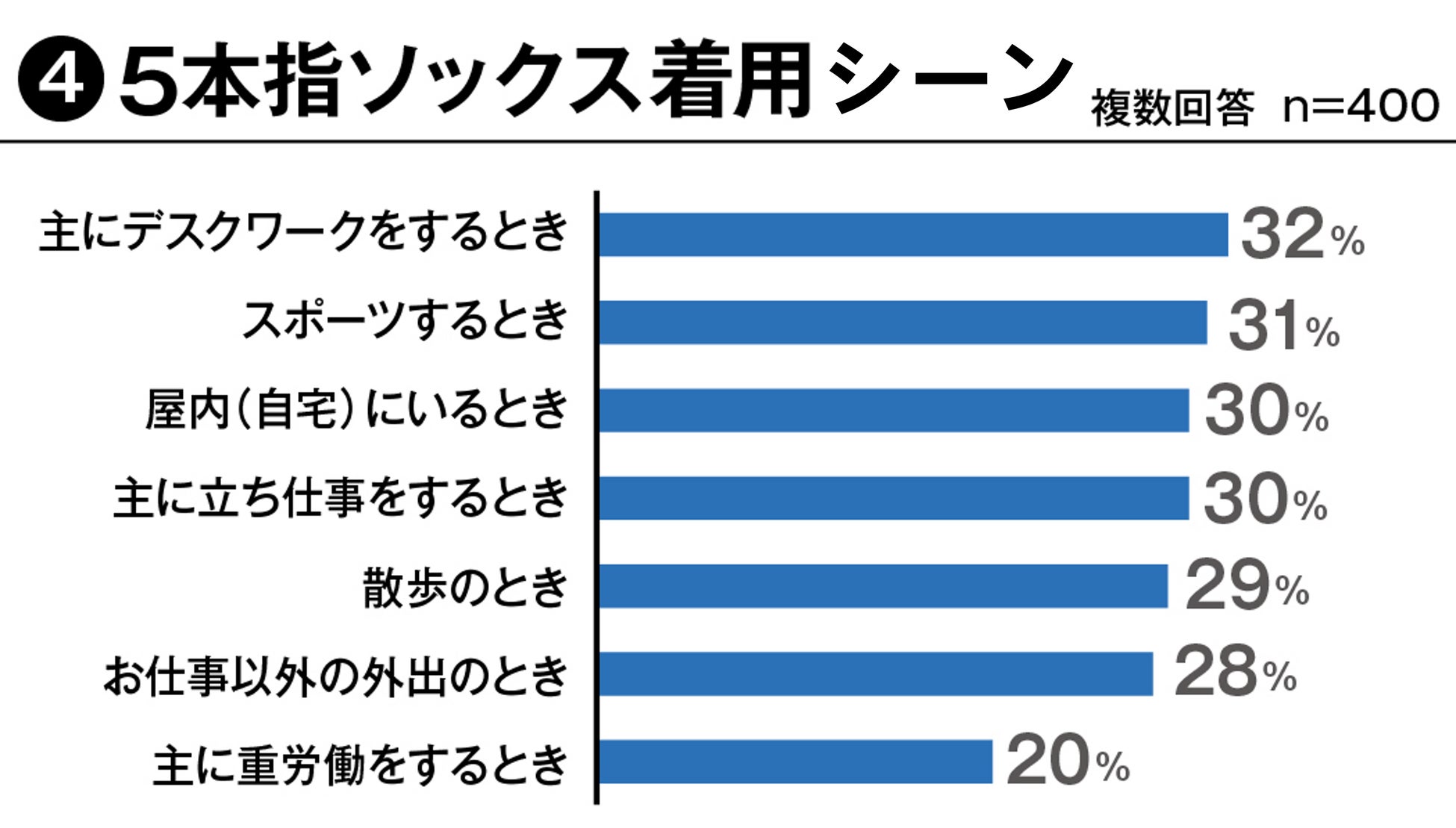 本調査で5本指ソックスの着用シーンについて尋ねたところ、回答の割合に大きな差は見受けられませんでした。様々なシーンで5本指ソックスが着用されていることが分かります。