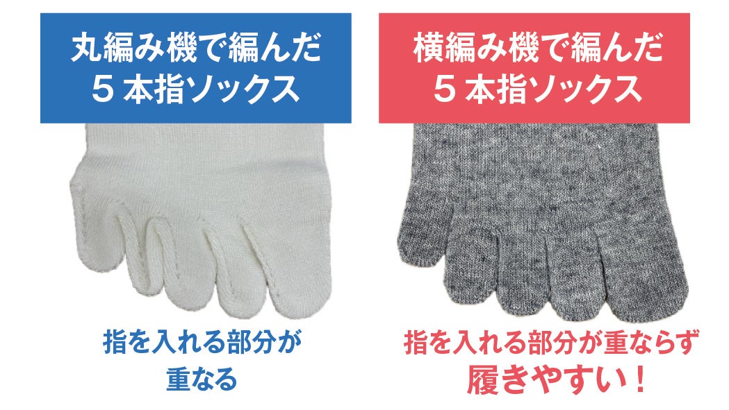 靴下の製造に使われている「丸編み機」を使って5本指ソックスを製造すると、指を入れる部分が重なってしまいます。この指の重なりが履きにくいと感じられる場合があります。