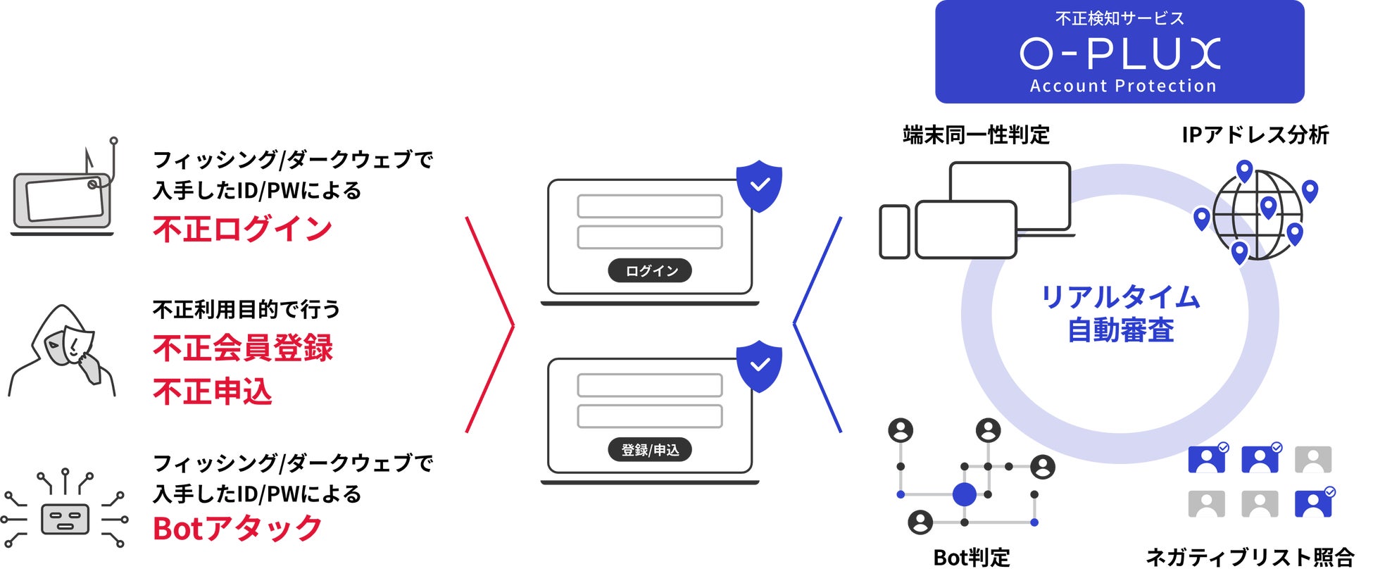Caccoが提供する不正検知サービス「O-PLUX Account Protection」は、「ログイン画面」「登録/申込画面」への「不正ログイン」「不正会員登録/口座開設/申込」「Botアタック」を検知/モニタリングするためのクラウドサービスです。