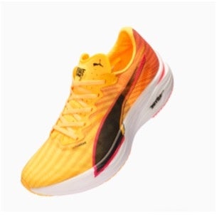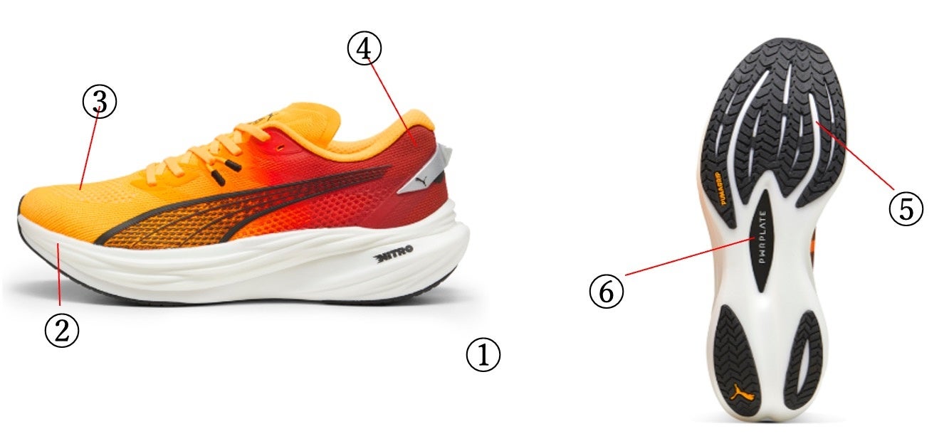 プーマの最先端技術である「NITROFOAM™」と「NITROFOAM™ ELITE」を搭載することで最高のクッション性と反発性を実現しています。カーボンファイバー製の「PWRPLATE(パワープレート)」は、スムーズで安定したスピードを提供し、エリート級の効率性を実現します。軽量エンジニアードニットのアッパーには、ストレスの多い部分をサポートする「PWRTAPE」が配置され、かかと部分をロールカラー構造にすることにより快適性とフィット感をさらに向上させています。軽量化された「DEVIATE NITRO™ 3」は、レース用シューズに匹敵する性能を誇ります。