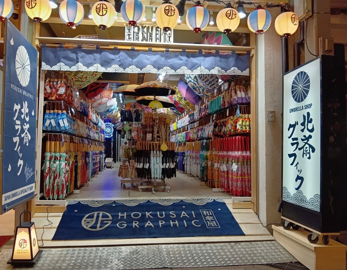 和柄傘ブランド『北斎グラフィック』の2店舗では、提灯・行燈・のれんを中心とした店頭デザインに刷新。やわらかな灯りと布の揺らぎが生み出す情緒的な空間は、祇園・錦市場という観光地にふさわしい佇まいを演出。
