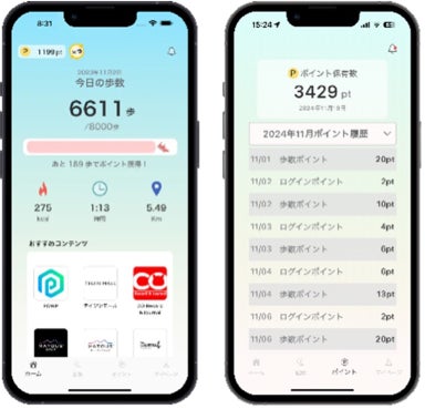 近年ではAI 技術やヘルスケアデータの活用が急速に進展しており、健康増進や健康管理の分野においても大きな変革が期待されています。このPHRアプリは、こうした時代のニーズを踏まえ、利用者の行動データ(例:位置情報や活動量)を高度なAI技術で分析して最新のヘルスケアデータと融合、個々のニーズに応じた健康管理機能を提供することで利用者それぞれの健康状態やライフスタイルに最適化したサポートの実現を目指しています。また活動量に応じて、ECサイトで引き換えができるポイントやNFT(非代替性トークン)が付与されるゲーミフィケーション要素を導入しており、ポイントやデジタル資産の獲得を通じて、利用者の積極的な健康管理行動を促進すると共に、楽しみながら健康を意識するスタイルへの行動変容も図っています。