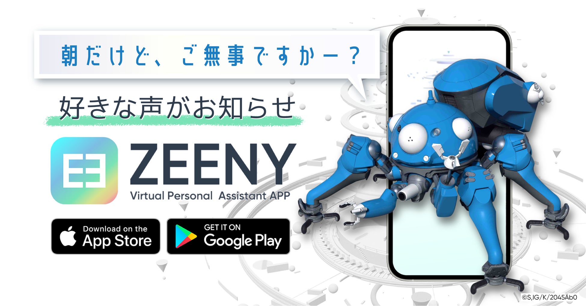 音声で時報、予定、スマートフォンのバッテリー残量などをお知らせしてくれる、iOS/Androidアプリ『Zeeny アシスタント』のサブアシスタントに、Netflixオリジナルアニメシリーズ『攻殻機動隊 SAC_2045』から『タチコマ』が追加されます。アプリを無料でダウンロードし、同アプリ内『Zeeny ボイスストア』にてキャラクターを購入することで、利用可能です。