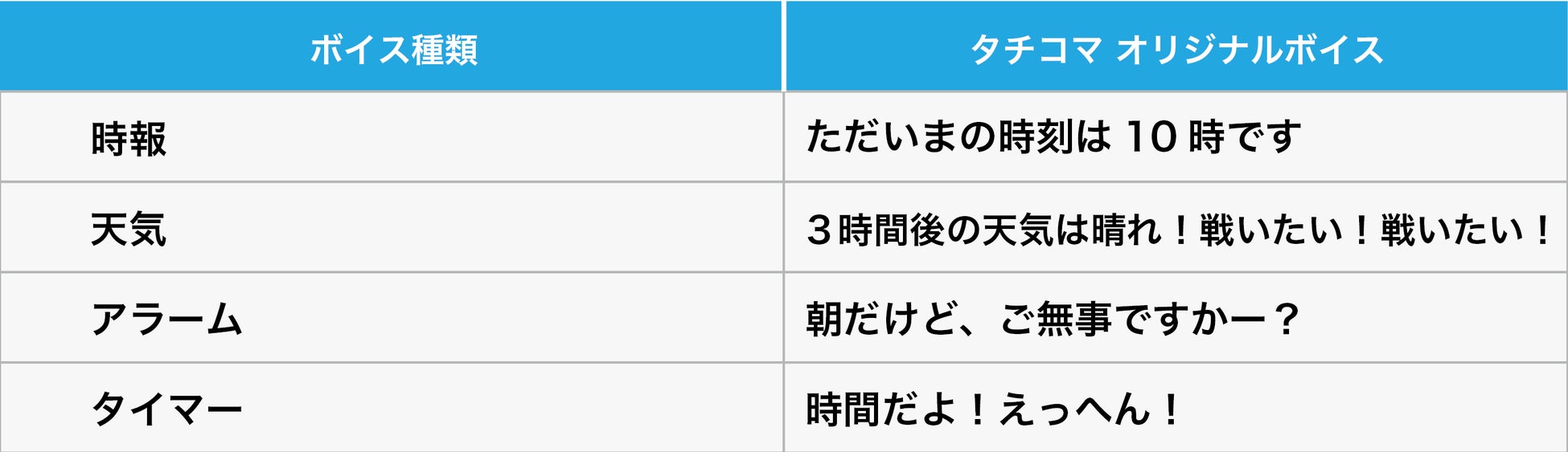 公安9課をサポートしている「タチコマ」のかわいくて元気なボイスがあなたの時間管理をお助けします。「あ、もうバイトの時間だった…」「やばい!配信が始まっている」など、毎日時間管理に追われるあなたのために、日常を音声でアシストしてくれます。