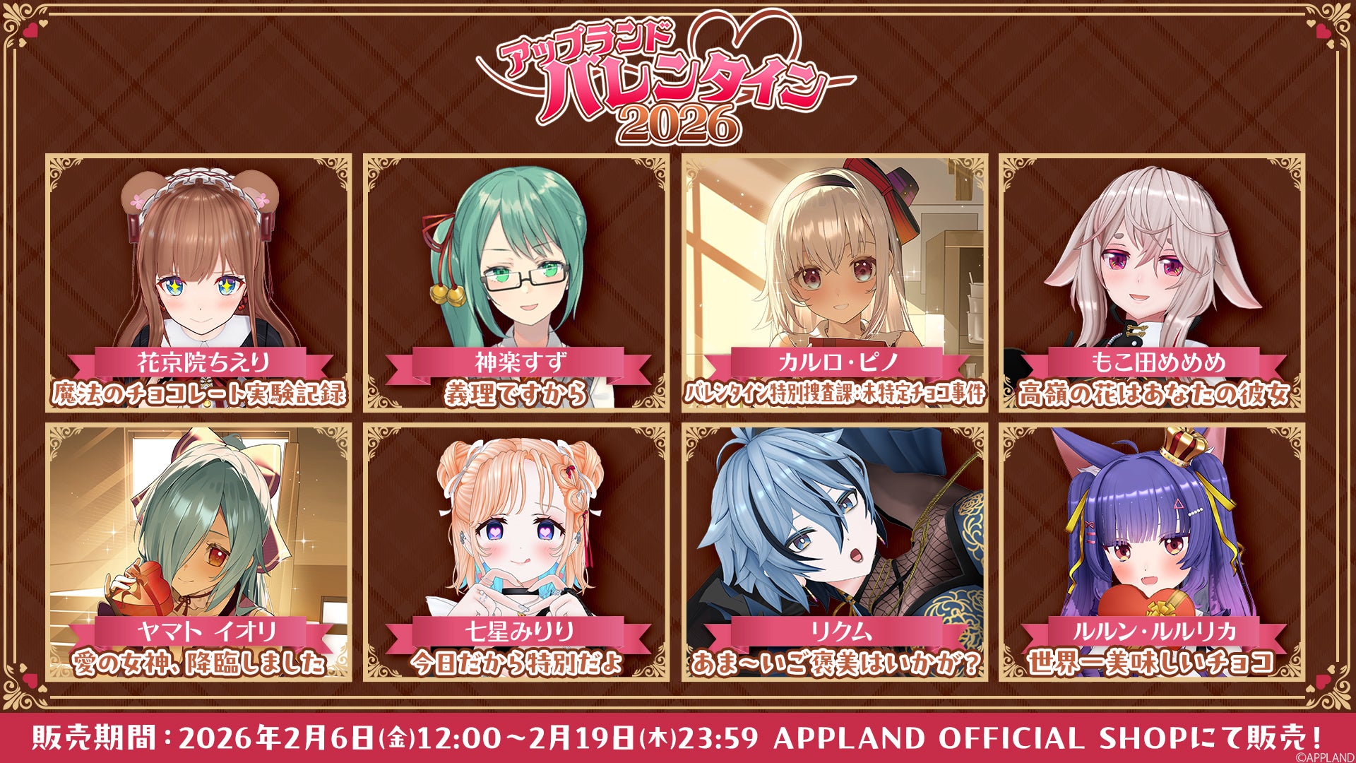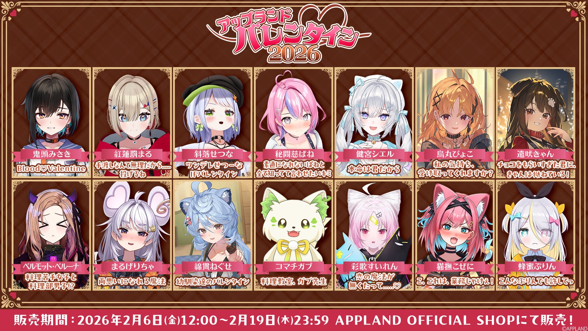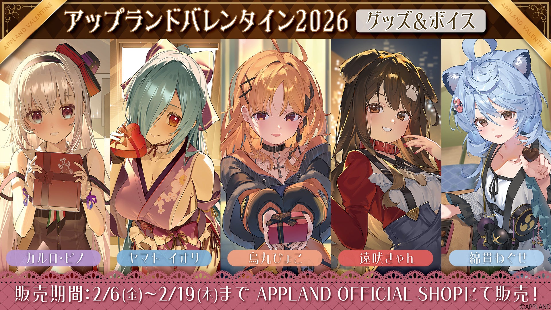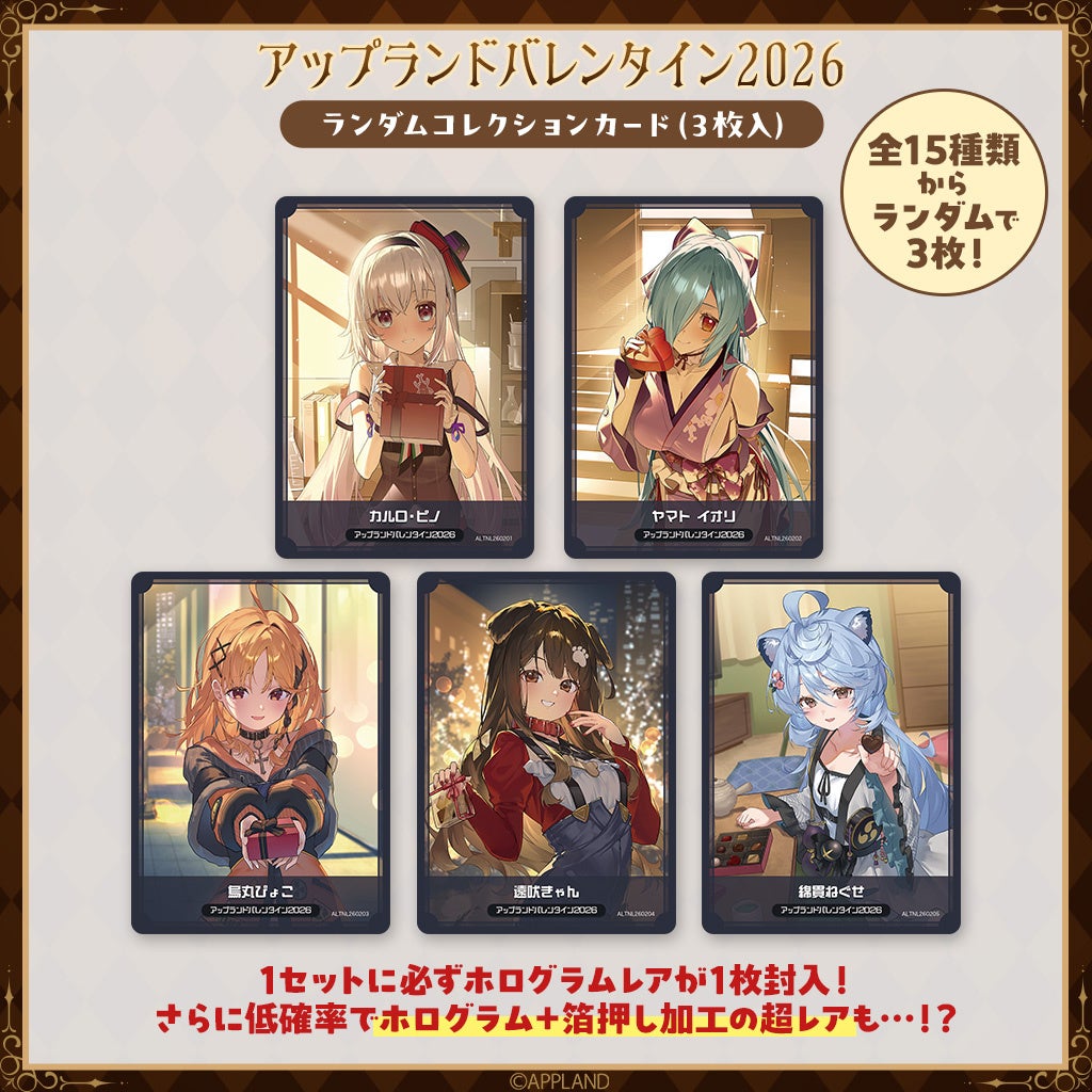 株式会社アップランド(本社:東京都世田谷区)が運営する「.LIVE」・「ぶいぱい」メンバー5名の『アップランドバレンタイン2026』グッズおよび総勢22名が参加する同テーマのボイスをAPPLAND OFFICIAL SHOPにて販売することをお知らせします。