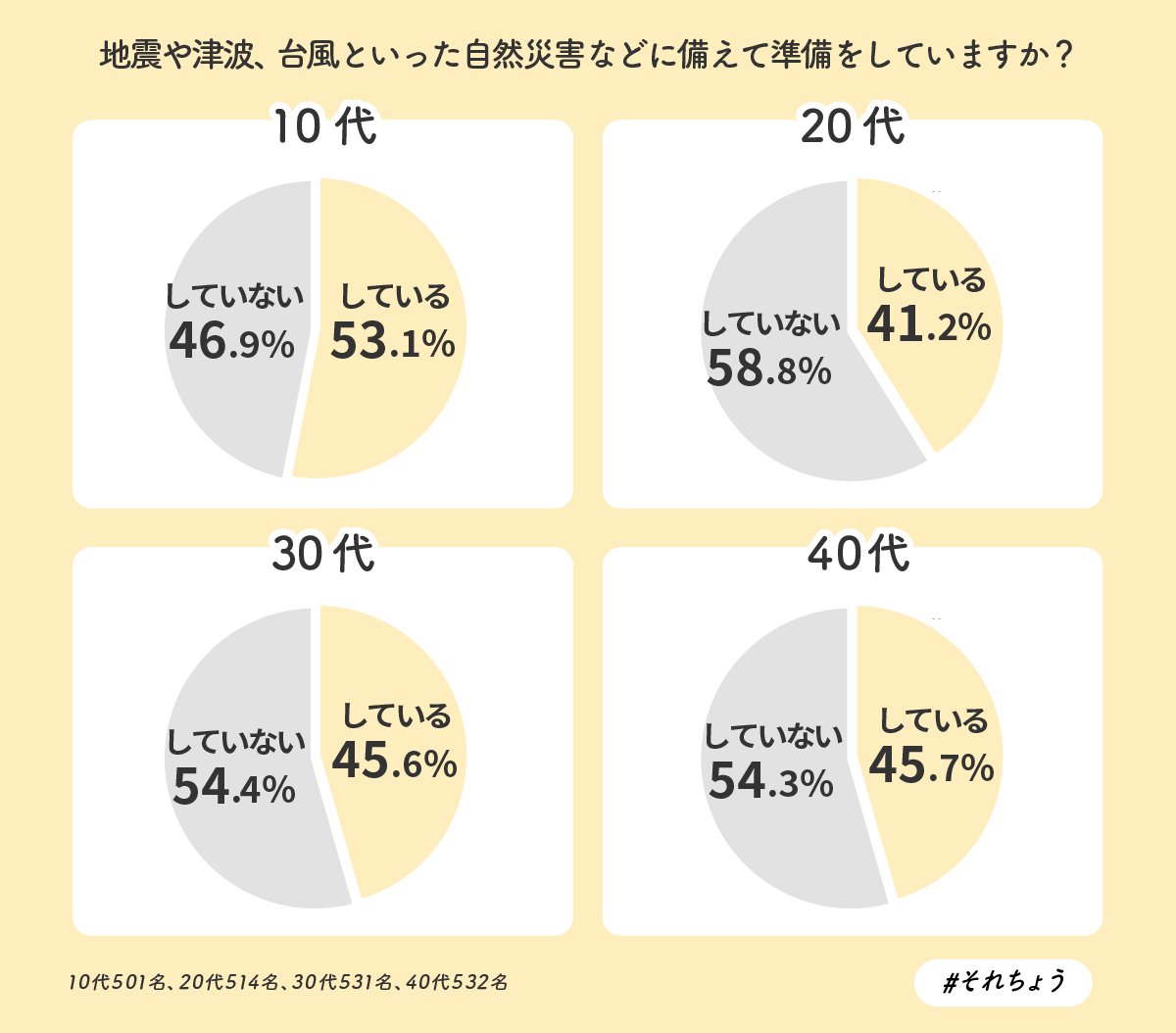 さらに、「地震や津波、台風といった自然災害などに備えて準備をしていますか?」と聞きました。「(災害に備えて準備をして)いる」と回答した人は、10代が最も多く53.1%、それ以外は4割程度となりました。