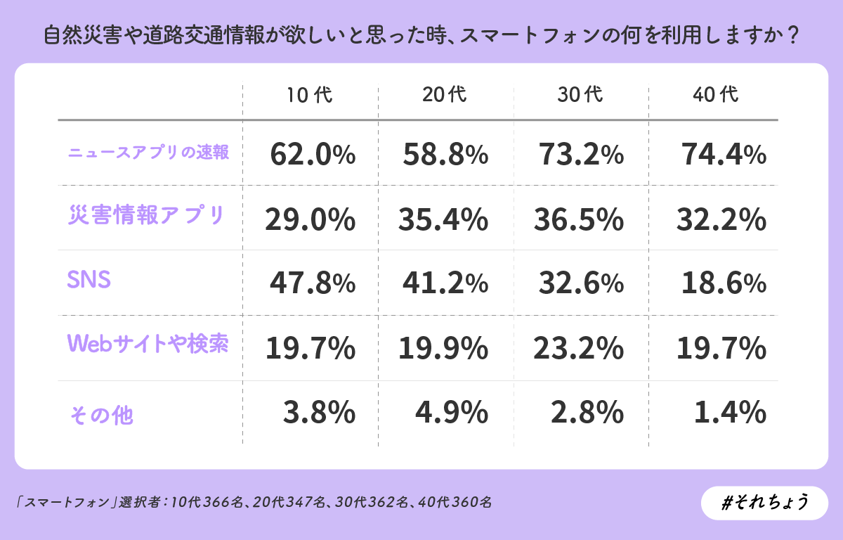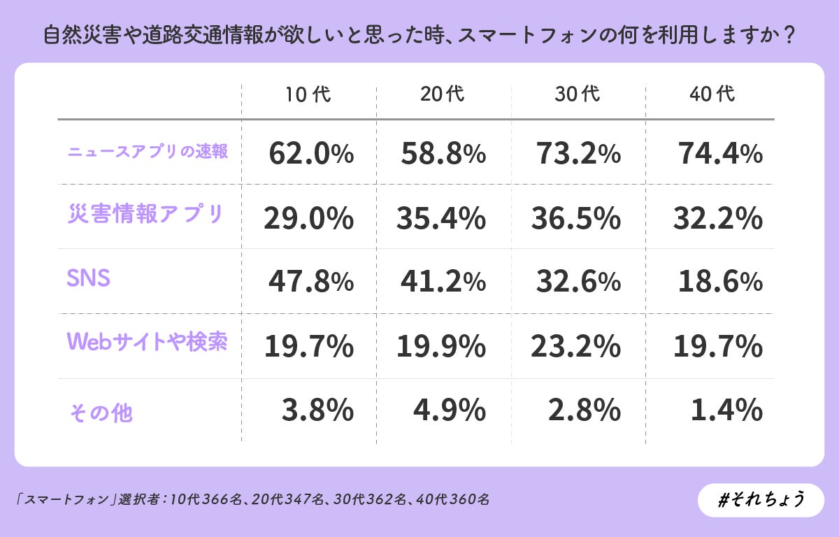 さらに、「自然災害速報や道路交通情報が欲しいと思ったときに確認する方法」でスマートフォンを利用すると回答した人を対象に「自然災害速報や道路交通情報が欲しいと思ったときに確認する方法」を聞いたところ、いずれの年代でも第1位は「ニュースアプリの速報」となり、10代で62.0%、20代で58.8%、30代で73.2%、40代で74.4%となりました。