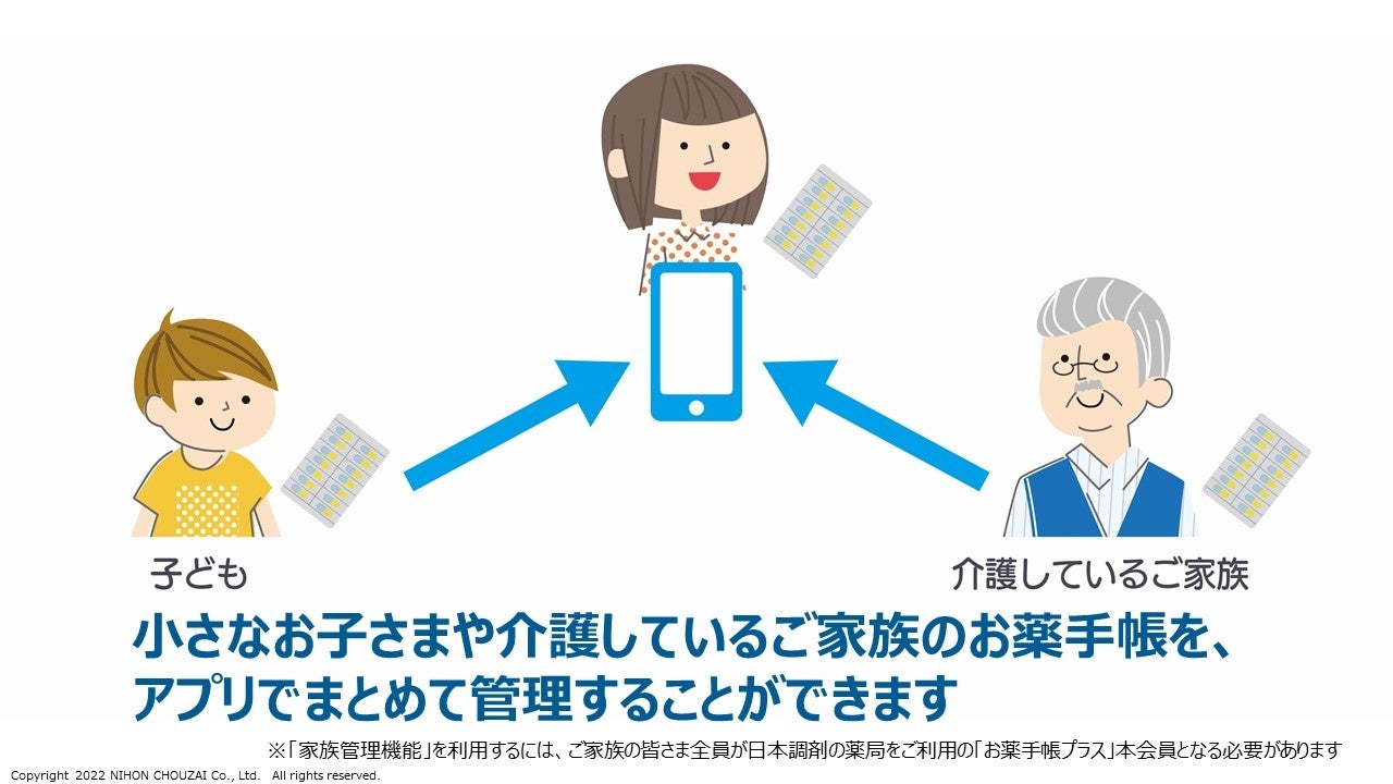 *2 「家族管理機能」を利用するには、ご家族の皆さま全員が日本調剤の薬局をご利用の「お薬手帳プラス」本会員となる必要があります
