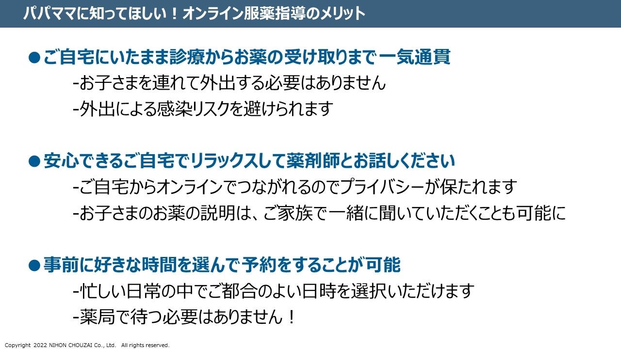 全国47都道府県で調剤薬局を展開する日本調剤株式会社(本社所在地:東京都千代田区丸の内、代表取締役社長:三津原 庸介、以下「日本調剤」)は、オンラインプレスセミナー『忙しいパパママの生活をサポートする「オンライン服薬指導」 ~働く親の暮らしやすさ・働きやすい社会の実現を応援する日本調剤~』を3月23日(水)に開催いたしました。
