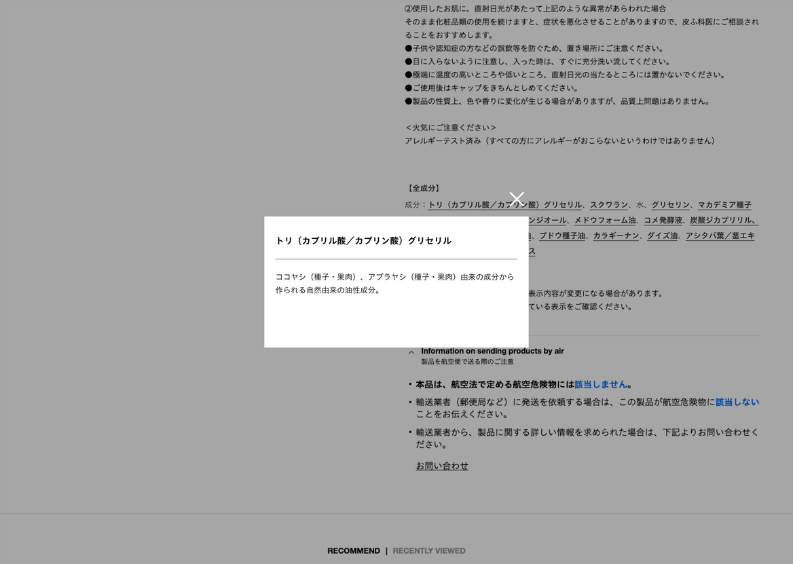 また植物由来の成分は、その使用部分(全草、種子、葉等)を記載。これらの情報は、ホームページ上の「成分表示」の各成分部分に、POPUPする形で説明文が入ります。