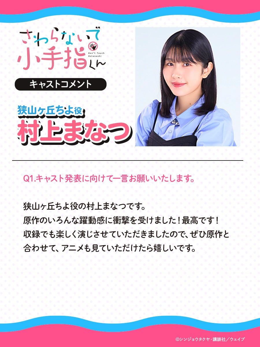 狭山ヶ丘ちよ役の村上まなつです。原作のいろんな躍動感に衝撃を受けました!最高です!収録でも楽しく演じさせていただきましたので、ぜひ原作と合わせて、アニメも見ていただけたら嬉しいです。