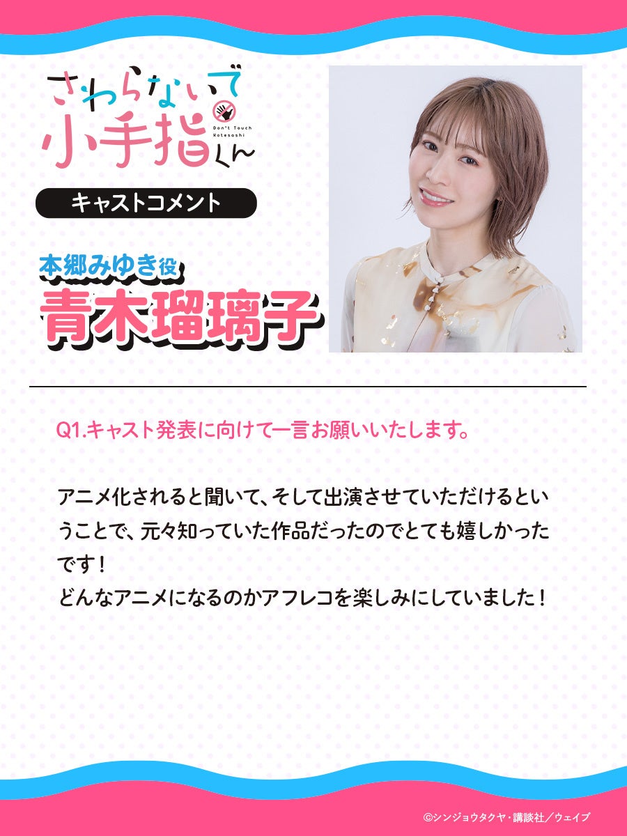 オーディションを受けたとき、アニメ化できるんだ!?と驚きつつも、とても記憶に残った作品でした。こうしてアロマちゃんを演じることができてとても嬉しいです!