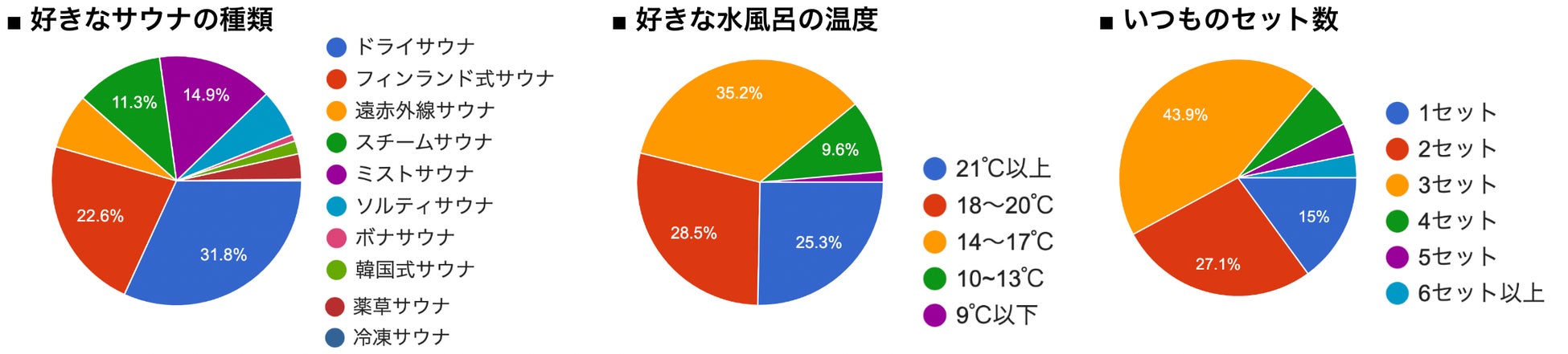 - 【みんなの好きなサウナ】=「ドライサウナ or フィンランド式サウナ」「水風呂は14〜17℃」「3セット」