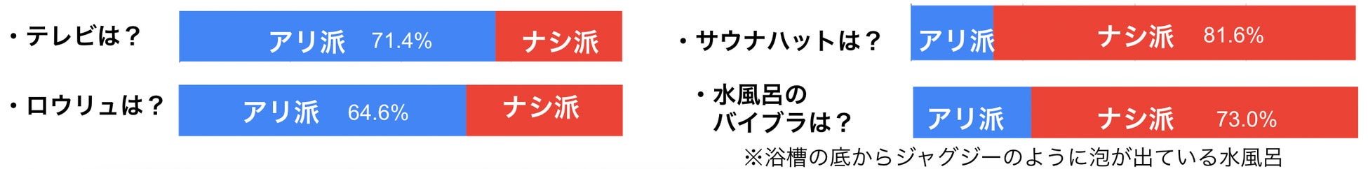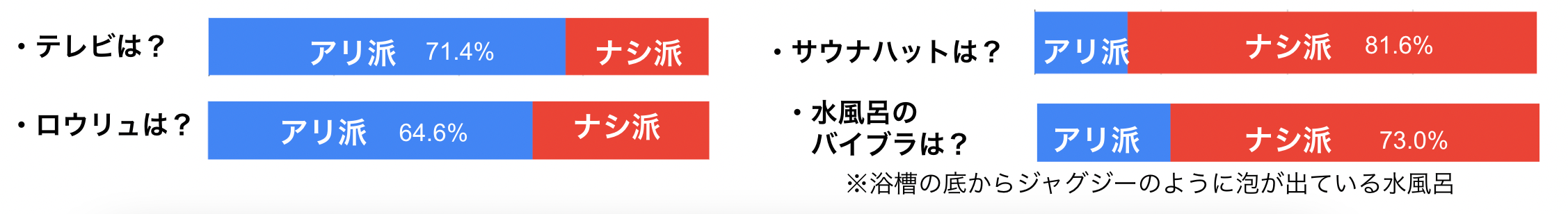 - 【サウナに関する アリ / ナシ?】=「テレビ・ロウリュはアリ」「サウナハットとバイブラはナシ」が多数派