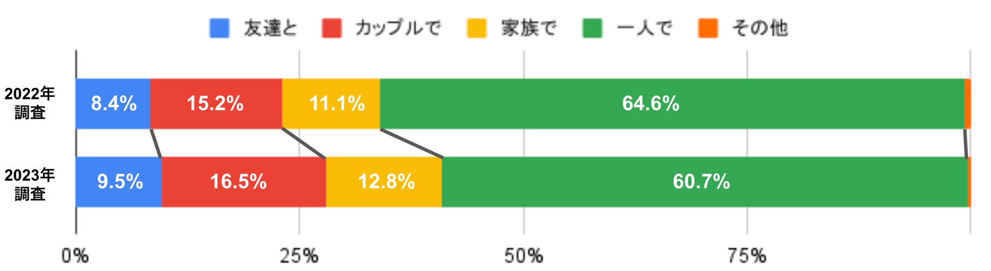 また、「誰と行くか」の調査では昨年同様「一人で」の割合が過半数を占めました。しかし、昨年より「一人で」の回答は4.0%減、「パートナーと(カップル・夫婦など)」「友達と」「家族と」がそれぞれ約1%微増しており、サウナには「一人で行く」という人が減り、「誰かと行く」人が増えてきていることがわかります。