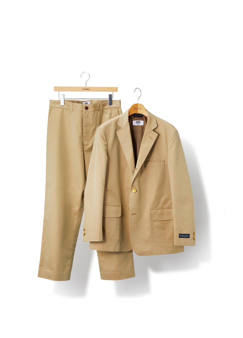 コットンポリエステルのギャバジン素材を使用したeYe JUNYA WATANABE MANのブレザーは、ブルックス ブラザーズの定番であるトラディショナルサックモデルをそのままに、今回のコラボレーションにおいて経糸にベージュ、緯糸にオレンジを織り込んだJUNYA WATANABE MANオリジナルのシャンブレー生地をセレクト。ライナーにはメッシュを配し、カジュアルなスリーパッチスタイルを表現しました。ブレザー同様のベージュシャンブレー生地を使用したトラウザーズのシルエットはJUNYA WATANABE MANアーカイブからのチノパン型を採用。セットアップでの着用も可能です。