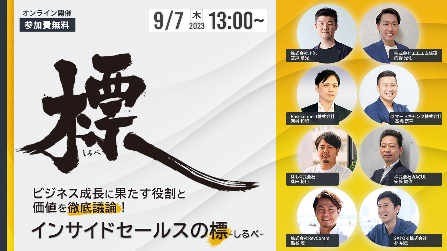マーケティングオートメーション(以下、「MA」)ツール「SATORI」を開発・提供するSATORI株式会社(所在地:東京都渋谷区、代表取締役:植山 浩介)は、BtoB企業において、顧客との関係性構築や、成約プロセスを進めるための中核を担う役割として必要不可欠となっているインサイドセールスにフォーカスし、「KPI設計」「ツール選定」「ナーチャリング」「ChatGPT・AI活用」という4つのテーマについて、深く掘り下げ討論するオンラインカンファレンス「インサイドセールスの標ーしるべー」を9/7(木)に開催します。