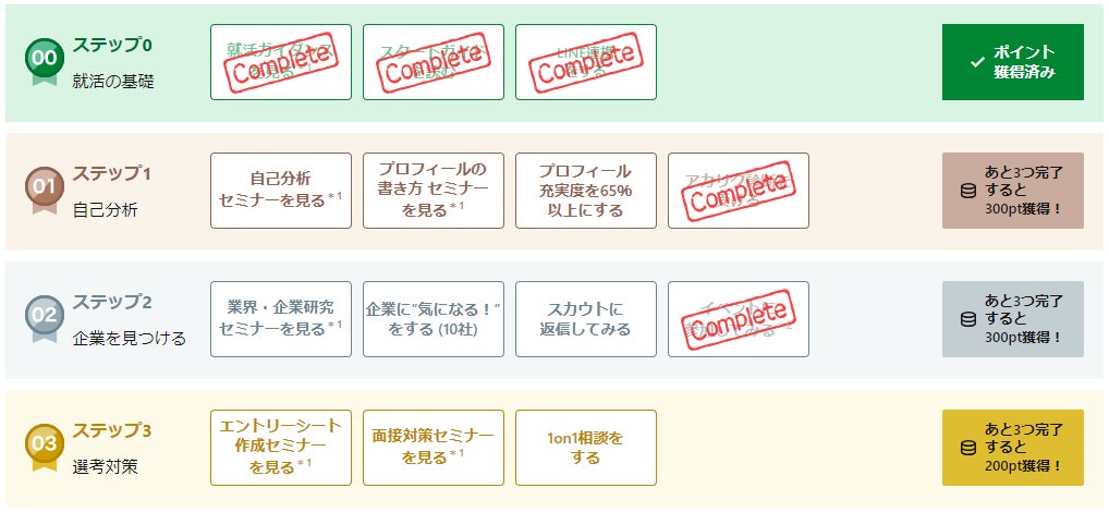 本サービスでは、⓪就活の基礎、①自己分析、②企業を見つける、③選考対策の4ステップを順番に取り組んでいくことで、効率的に就活を進めることができます。また、各ステップを完了することで、様々な特典と交換できる”アカリクポイント”を獲得できます。就活に対する敷居の高さを軽減し、ゲーム感覚で進められるのが特徴です。