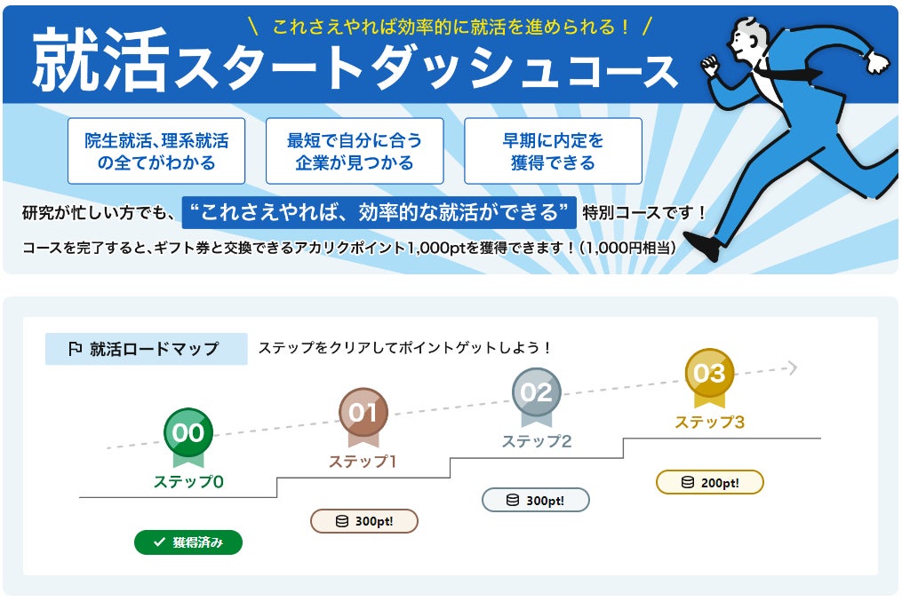 「就活スタートダッシュコース」では、大学院生・理系学生に合わせた観点で就活の全体像を学び、自己分析や業界研究からES作成・面接対策まで実践することができます。コースに沿って進めることで様々な企業と効率的に接点を持つことができます。今後、「就活スタートダッシュコース」の提供開始により、大学院生・理系学生のキャリアにおける不安を軽減し、さらに効率的にキャリアに関する意思決定ができるよう、より一層サポートしてまいります。