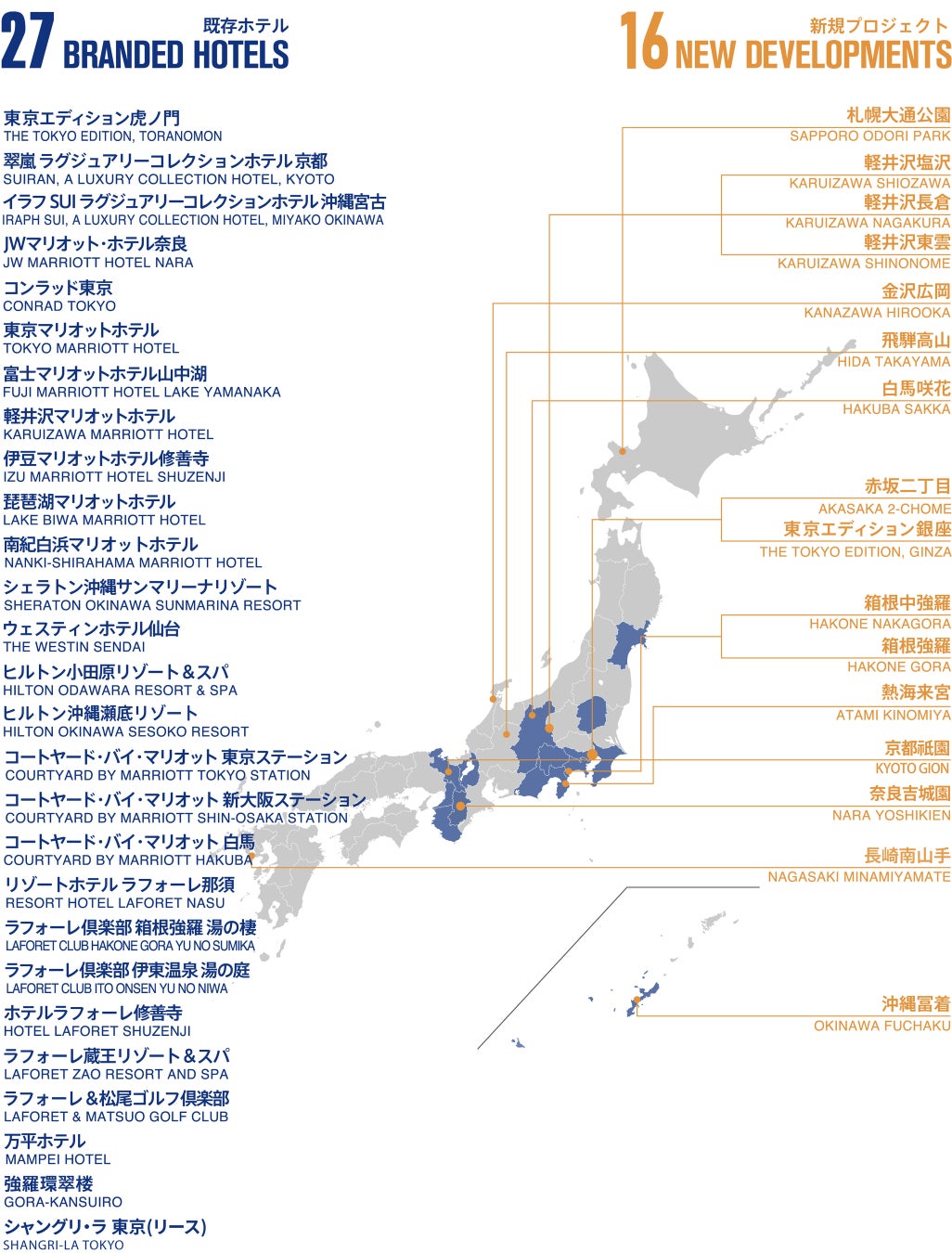 森トラストグループの中核事業であるホテル&リゾート事業では、2022年10月5日現在、全国に27件のホテル&リゾート施設を展開しているほか、東京都心部では2件、地方では14件の新規ホテル開発など、計16件のホテルプロジェクトを推進しています。